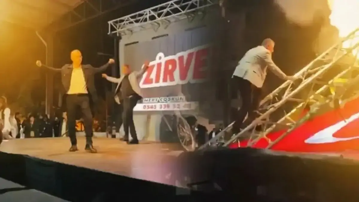 Aydın'ın Kuyucak ilçesinde düzenlenen etkinlikte aniden bastıran fırtına nedeniyle dev LED ekranın sahneye devrilmesi büyük panik yarattı. Zeybek oynadıktan saniyeler sonra sahneden inen Belediye Başkanı Uğur Doğanca olası bir faciadan son anda kurtuldu.
